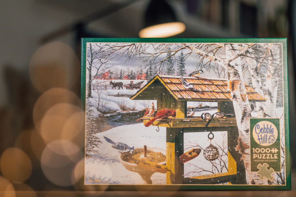 Zimní romantika s ptáčky na krmítku a vánoční shon za ním. Ještě že jsem v obchodě puzzle se scenérií vytíženého krmítka nenechala! Jako správný ptačí nadšenec jsem se okamžitě jala objevovat vyobrazené, neznámé ptačí druhy. Dle mých zjištění jsou to kardinál červený, sojka chocholatá, brhlík běloprsý, severoamerické sýkory neboli chickadees. No není to vzrušující?! :o)