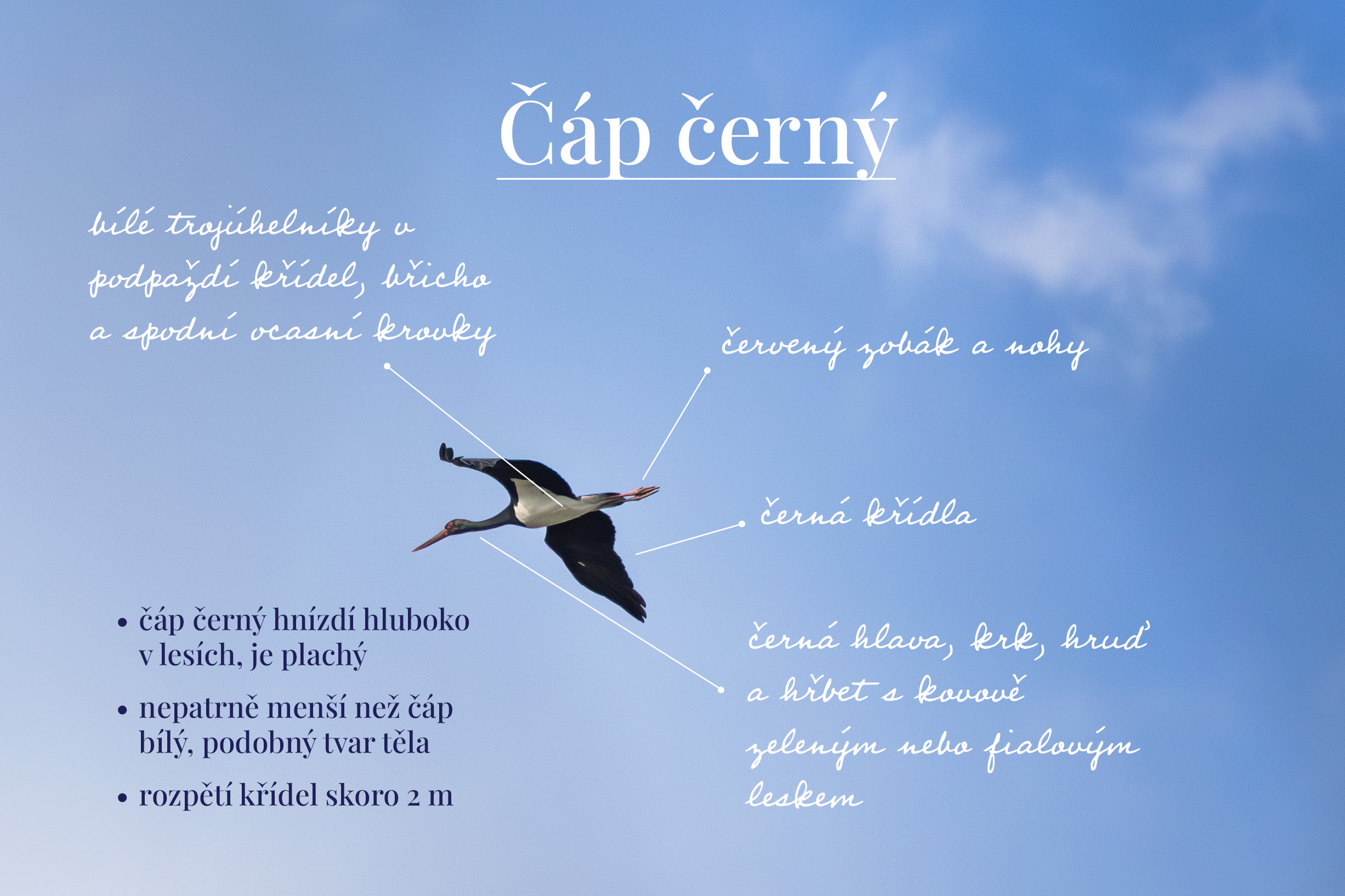 Přelet vzácnějšího čápa černého byl pro mě šťastný okamžik. Jsem ráda, že jsem si ho mohla ulovit tím nejlepším způsobem lovu: lovem beze zbraně – fotografií. Stejně radostné je pro mě studovat výsledné fotografie a poznávat zajímavosti o dalším fascinujícím ptačím druhu. Zastavte se a pozorujte ptačí hejna i jednotlivé ptáky, kteří prolétají na nebi. Stojí to za to.