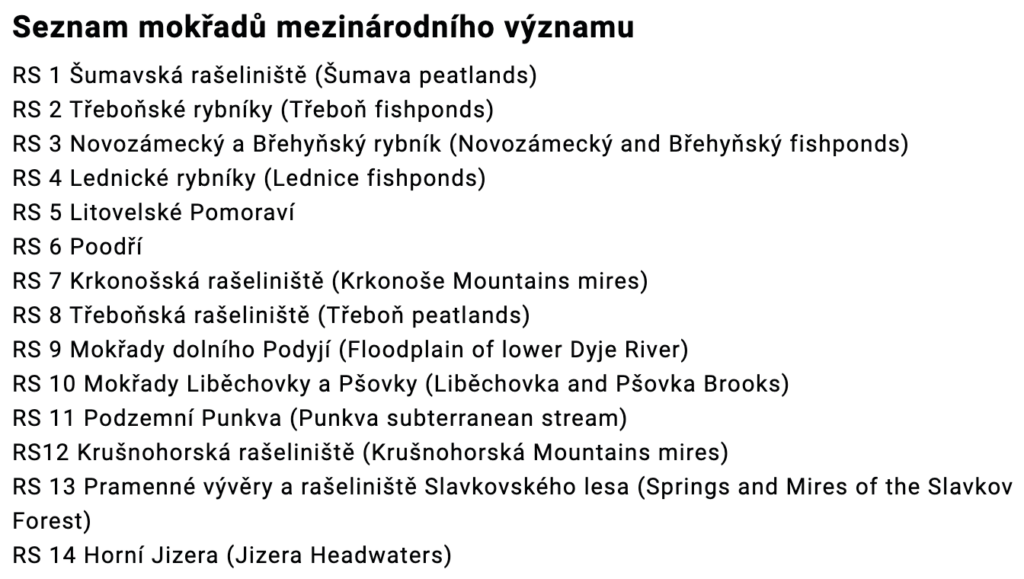 Seznam českých mokřadů mezinárodního významu podle Ramsarské úmluvy o mokřadech. Zdroj: Ministerstvo životního prostředí (mzp.gov.cz)